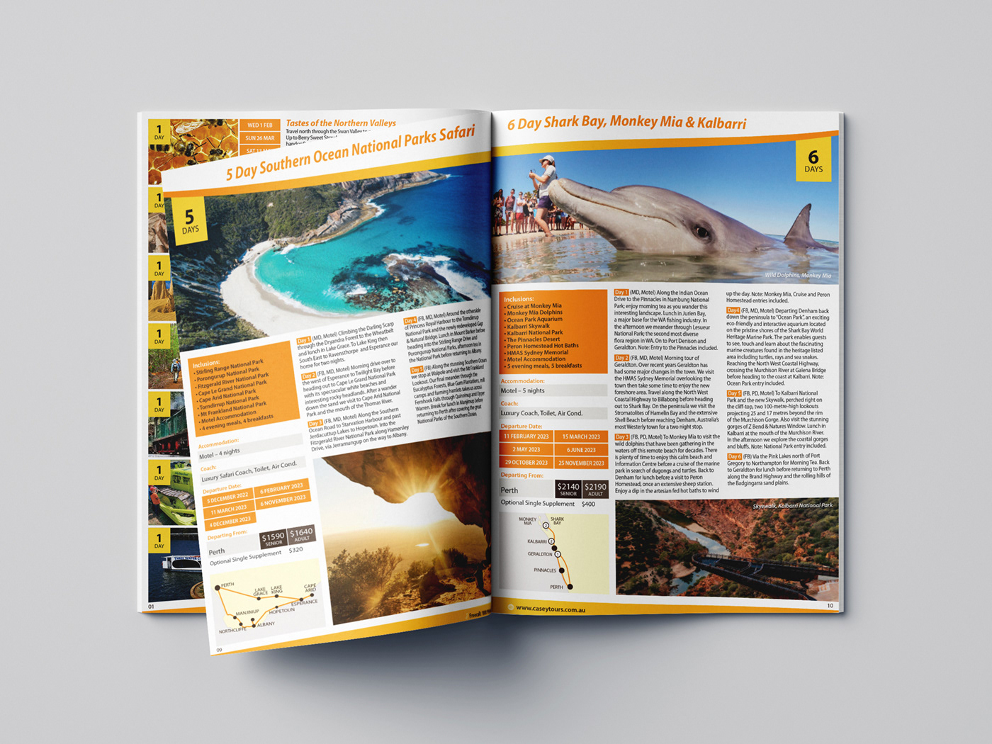 Details // Casey wanted to give their tour brochure a face lift, so I took on the challenge to make a lot of information on every page look more spacious and easy on the eye. They only required 6 sample pages to create a template.
